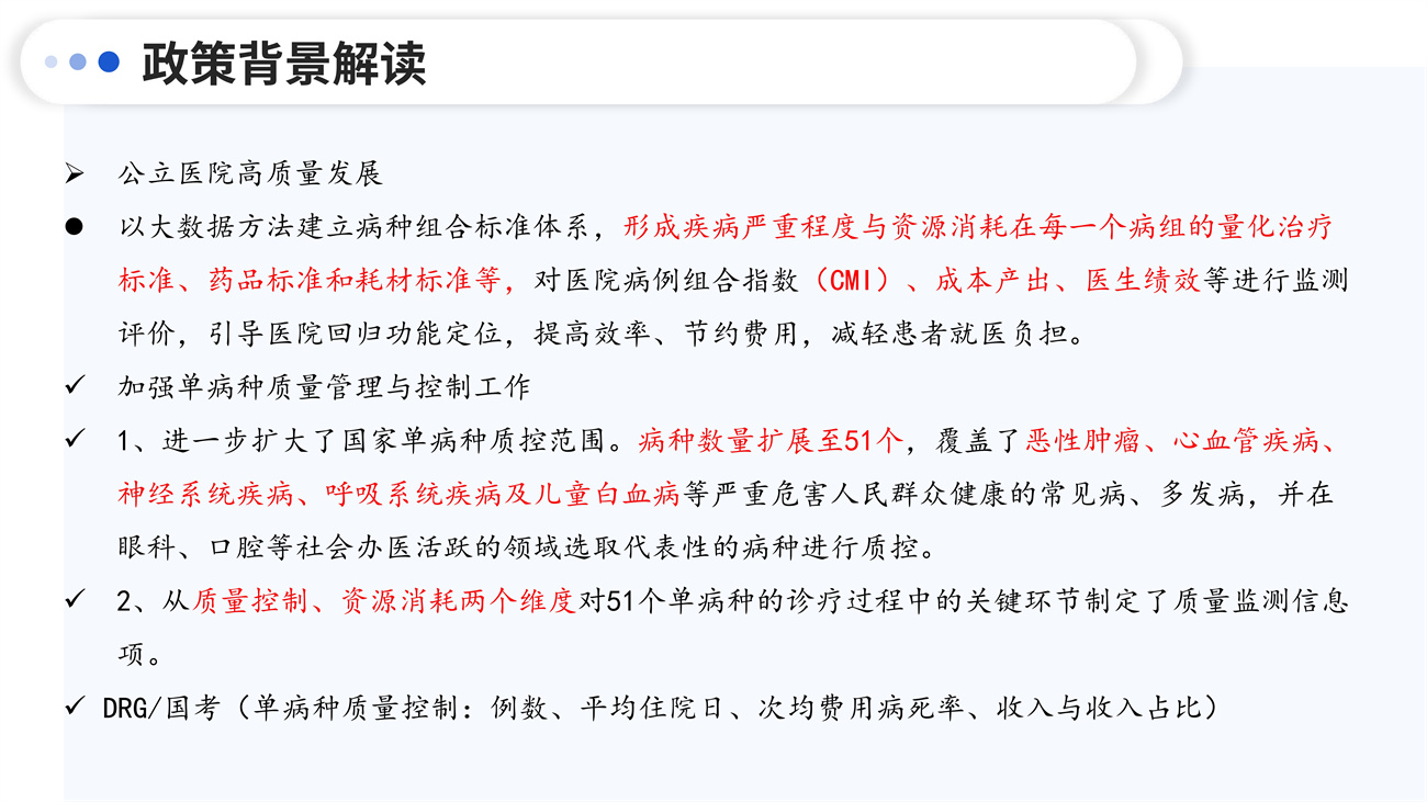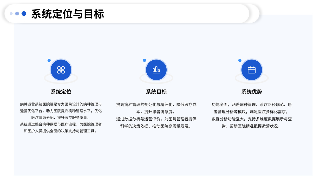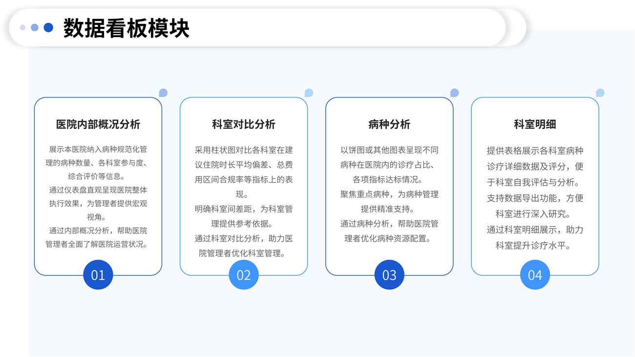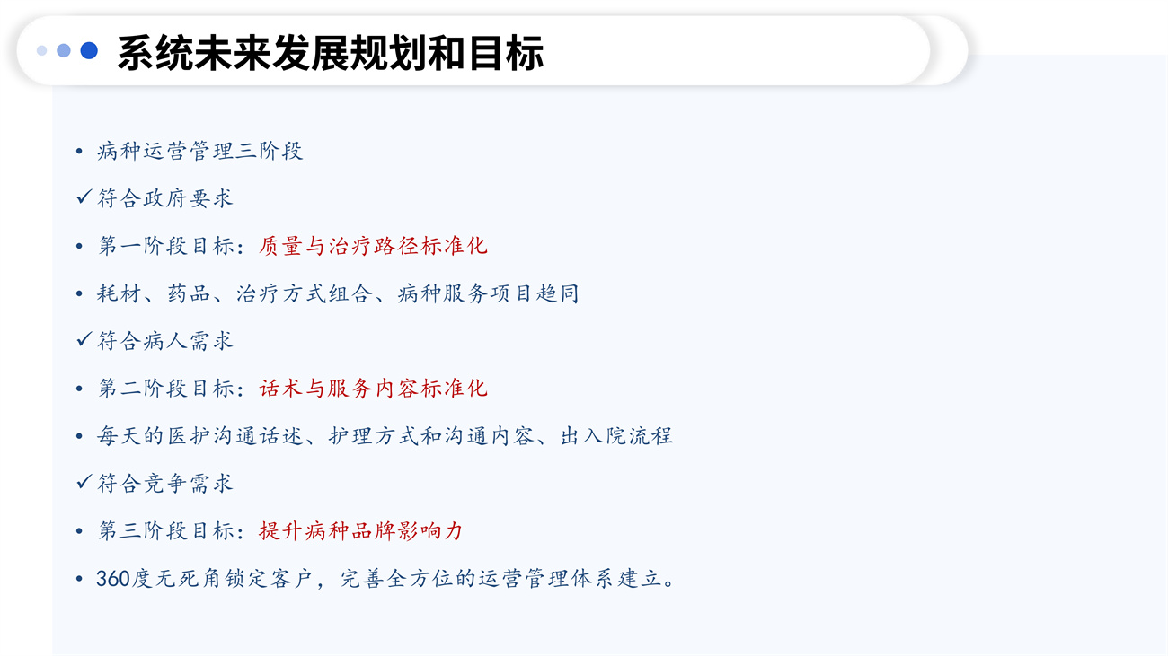 病种运营管理系统,基于数据驱动和分析的病种运营管理平台,病种运营系统是为医疗机构提供病种管理、运营评价、数据分析等一站式解决方案的平台,助力医院提升病 种管理水平和运营效率。系统通过整合病种相关数据,实现对病种全生命周期的管理,为医院管理者提供决策支持,推动医院高质量 发展。